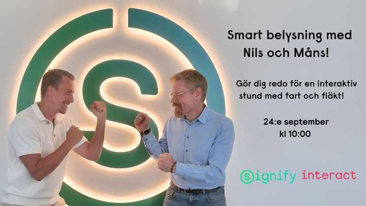 Tycker du att det där med smart belysning verkar lite svårt och luddigt? Var bara lugn. Den 24 september håller Signifys ikoniska duo Nils & Måns ett riktigt rivigt webinarium för att råda bot på eventuella okunskaper. Varning för givande diskussioner, hockey-referenser och nästintill oändlig kunskap om Interact Pro.